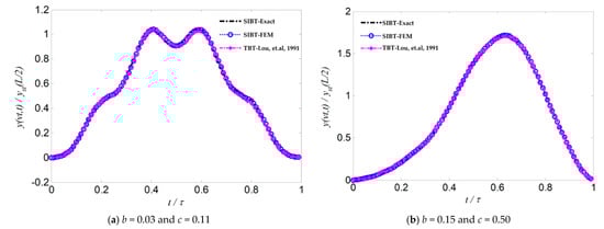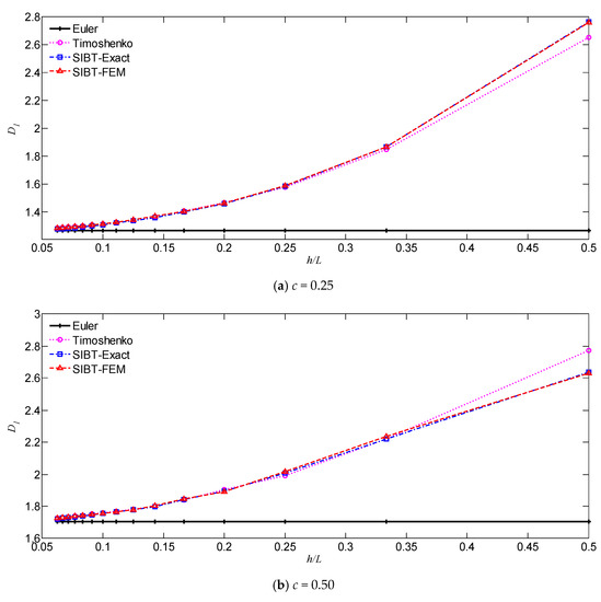 To further compare the dynamic responses of the SIBT, Euler–Bernoulli and Timoshenko beams with different slenderness ratios, based on Table 2, the ratio of the cross-sectional dimension to beam length is reset from 1/16 to 1/2. One can find from Figure 10 that, as the ratio of the cross-sectional height h to beam length L increases, the dynamic magnification factors for mid-span displacement obtained by the Euler–Bernoulli always remain 1.266 and 1.706 when c = 0.25 and 0.5, respectively. In contrast, the dynamic magnification factors for mid-span displacement obtained by the SIBT and Timoshenko beams become larger and larger than that obtained by the Euler–Bernoulli beams. Furthermore, until the h/L is greater than 1/3, the difference between the calculated results of the SIBT and Timoshenko beams is apparent. Taking h/L = 1/2 as an example, when c = 0.25, the dynamic magnification factors for the mid-span displacement obtained by the Timoshenko model is 2.652, and that by the SIBT is 2.766. When c = 0.5, the dynamic magnification factors for mid-span displacement obtained by the Timoshenko model is 2.772, and that by the SIBT is 2.638.