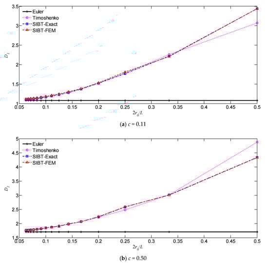 Figure 12 further presents the dynamic magnification factors of mid-span displacement of the SIBT, Euler–Bernoulli and Timoshenko beams with different slenderness ratios. Based on Table 1, Rayleigh’s coefficient is reset from to , while keeping the beam length constant. As the ratio of the cross-sectional diameter to beam length increases, we can draw conclusions similar to Figure 10. For the Euler–Bernoulli beam, the dynamic magnification factors for mid-span displacement remains 1.075 and 1.706 for c = 0.11 and 0.5, respectively. The dynamic magnification factors for mid-span displacement obtained by the SIBT and Timoshenko beams are constantly increasing. Furthermore, until the ratio is greater than 1/3, the difference between the calculated results of the SIBT and Timoshenko beams becomes apparent. This phenomenon is attributed to the significant influence of the shear inertia in the SIBT model.