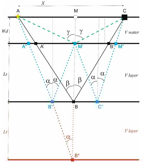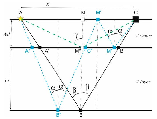 Figure 1 displays a simple 1D Earth model, composed of two homogeneous layers with horizontal interfaces: seawater, with a thickness Wd, and an underlying shallow formation, with a thickness Lt. The P-wave propagation velocities are Vw and Vlayer, respectively. Along the sea surface, a source and a receiver are located at points A and C with an offset X. The ray paths of three different signals are drawn, assuming that the ray bending can be neglected: the primary reflection from seafloor AM*C (dashed green line), a primary reflection AA′BB′C from the layer bottom (black continuous line) and a peg-leg multiple AA″B″C″M′M″C (dotted blue line). Another event that can be used optionally is the direct arrival of AMC.