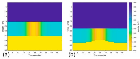 Synthetic model with horizontal interfaces and a Gaussian velocity anomaly in the depth domain (a) and in the time domain (b).