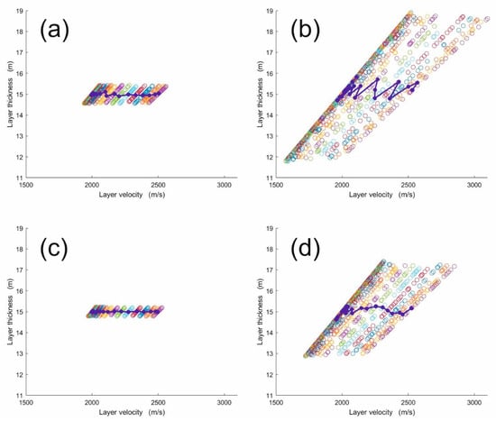 The circles present the estimated layer velocity and thickness obtained by perturbing randomly the input data in different ways. Dots with the same color correspond to the same perturbed offset along the profile over the model in Figure 3. The correct thickness is 15 m, while the velocity ranges from 2000 to 2500 m/s. The thick blue line joins the averages of the perturbed offsets in each line. The perturbations are (a) the offset, up to 1%; (b) the intrabed multiple, up to 0.01% with a 2.5 m offset, (c) with a 10 m offset, and (d) with 0.1% perturbation but still with a 10 m offset.