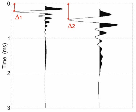 Figure 5 shows two minimum-phase wavelets with different frequency bandwidth: The first is 300–9000 Hz, similar to the nominal range of the Boomer source we used; the second is 300–4500 Hz, which can mimic a signal after some propagation in a dissipative medium, as mainly high-frequencies are absorbed. We obtained them by filtering a unit spike at the time zero with minimum-phase Butterworth filters with the frequency ranges mentioned above. The sampling rate was 1 microsecond. If we choose the largest peak of this signal, as we should in practice to overcome the background noise, we obtain two different delays Δ1 and Δ2, where the second is almost double the first one. Therefore, we may have to introduce a time shift in our picked travel times, which is ideally time-dependent. In practice, however, a negative time shift of the order of 0.5 ms may be needed for the arrivals of intrabed or peg-leg multiples.