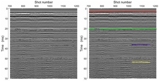 Seismic section acquired at the Gulf of Trieste (Northern Adriatic Sea) using a Boomer system without (left) and with the selected horizons (right): direct arrival (red), seafloor reflection (green), primary reflection (violet), and peg-leg multiple (yellow).