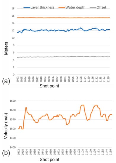 Figure 7a shows the estimated water depth (orange line), which is very smooth as expected by the visual inspection of the seismic section. Less obvious is the smoothness of the estimated offset (grey line), because surface waves and possible rapid turns in busy areas might introduce irregularities. Slightly less stable is the estimated layer thickness (blue line). Its calculation (and that one of the layer velocity) depend heavily on the selection precision of the multiple and the reflection from the layer bottom. Both travel times may be affected by larger errors because their time break is far less evident than that for direct arrivals and water bottom reflections. For this reason, we applied a five-term median filter to the velocity estimate (Figure 7b). The obtained values ranged between 1500 and 1600 m/s and are well consistent with those measured by [22], a dozen kilometers apart from our study area. These values are average velocities between the layer bottom and the seafloor. We observed that the estimated velocity oscillated above and below the seawater velocity. The low values are likely due to some extent of gas saturation, which is known to occur in several parts of the Gulf of Trieste (see also [23,24], etc.).