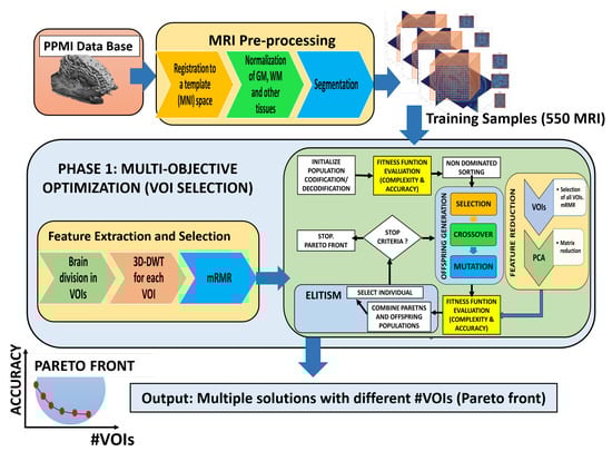 The proposed methodology presented in this contribution for Parkinson’s disease detection using MRI consists of five main stages for training the system in order to obtain the regions/volume of interest (VOI): (1) Pre-processing the NIfTI files (normalization, segmentation); (2) Feature Extraction (using 3D discrete wavelet transform (3D-DWT)); (3) Feature Selection and Reduction (using minimum Redundancy Maximum Relevance (mRMR) and PCA algorithms); (4) Detection of regions/volume of interest (VOI) (using multi-objective genetic algorithm NSGA-II); and (5) Optimization of the SVM classifier with the selected VOI. The block scheme for multi-objective optimization (VOIs selection) is shown in Figure 1. The main functional blocks are described in the following sub-sections.