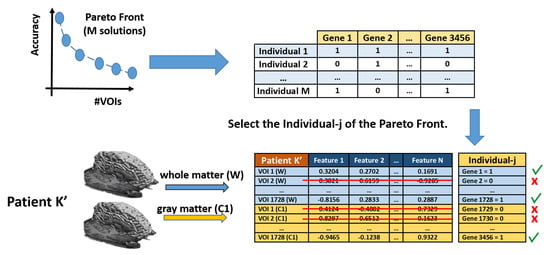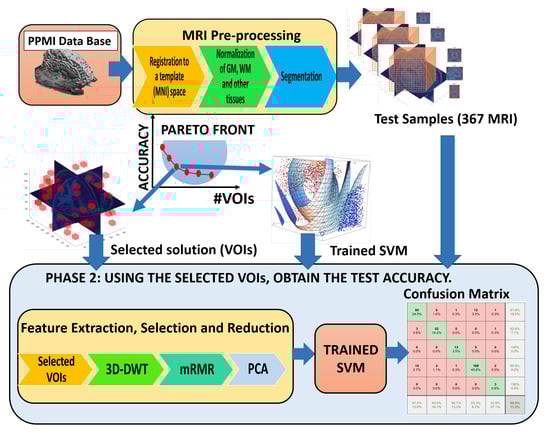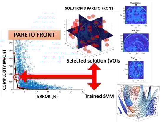 It is relevant to emphasize that the MRIs used during the first phase (optimization phase for VOI selection) are different and independent from the MRIs used in the testing phase. Carrying out the test phase guarantees the solidity and robustness of the results presented by the proposed methodology. Different Pareto front solutions and configurations regarding the selection of the VOIs selected (gray matter, whole matter or both) were tested, showing in Table 5 some of the most relevant results.