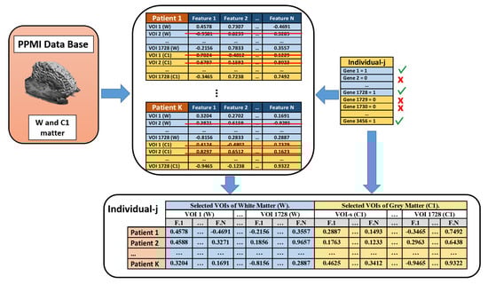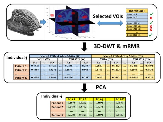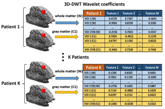 Each feature corresponds to the coefficients of the wavelet transform, obtaining M coefficients for each of the volumes analyzed in each patient and for each type of matter (W and C1). The brain of each patient is divided into 1728 different, non-overlapping VOIs, each one with a dimension of 12 × 14 × 10 voxels.