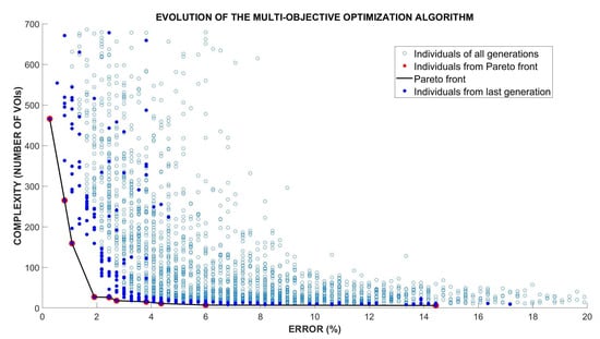 Figure 12 shows the complexity (measured as the number of VOIs), together with the error obtained for the classification in the training stage, for all the solution populations of the MOE (zoomed to 700 VOIs solutions). The last generation solutions (filled blue circles) and Pareto front solutions (filled red circles) are also included in the figure.