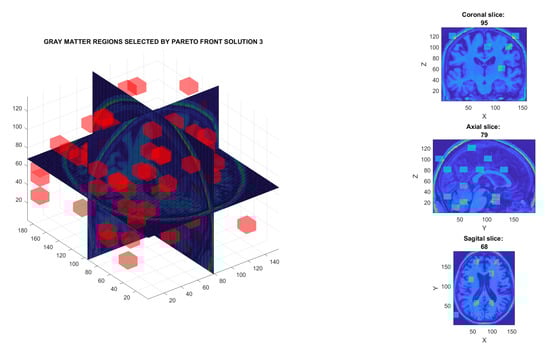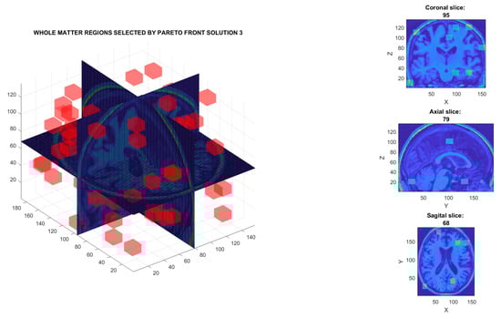 Table 6 shows the locations of the 73 and 86 VOIs selected by the third solution of Pareto Front, for whole and gray matter, respectively. Graphically, Figure 14 and Figure 15 show the location in three-dimensional space of these VOIs in the brain. In the left part of the figures, the spatial location of the selected VOIs is shown. On the right side, and in order to facilitate its location in slices, three slices of the brain and the location of the VOIs are presented.