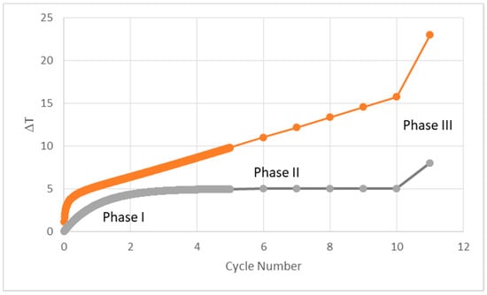 Upon initial loading, the coupon surface temperature is close to the ambient environment, the heat generation rate is constant, . In Phase I, the incremental temperature rate gradually decreases as heat dissipation, by means of heat convection through the specimen surfaces, increases. When it comes to phase II, self-heating temperature stabilization occurs, and it remains constant for a prolonged period. This stabilization is reached due to the equilibrium between the thermal energy generated from self-heating, and the thermal energy outgoing to the environment through convection and radiation (often negligible). Equation (14) describes the phase I–II behavior. A self-heating scenario depends on the level of applied stress. In some cases, e.g., [9,23,25], the thermal equilibrium does not occur, and the second phase is characterized by a temperature increase at a nearly constant rate. This phenomenon can be induced by several mechanisms, such as cyclic microstructural changes and progressive damage development in the form of voids and microcracks. These topics need to be further characterized with the aid of metallographic examinations, which are beyond the scope of the present paper. When microcracks accumulate, it ends phase II of self-heating and triggers phase III. Phase III is characterized by an accelerating temperature increase, as the process is dominated by the frictional heating at a macroscopic scale, i.e., the newly appeared surfaces of a propagating crack start to slide against each other under cyclic loading, leading to changes in calorimetric performance.