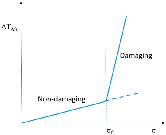 The typical temperature increment curves are schematically shown in Figure 2. The calorimetric behavior generally consists of three phases. Phase I exhibits a rather steep temperature increase. In phase II, the temperature is often stabilized at a constant level, ΔTAS, or in some cases, it may also increase at nearly a constant rate. Phase III represents an unstable phase of temperature increase up to fracture. The Risitano method determines the fatigue endurance limit by plotting curves of the stabilized temperature increment ΔTAS or the initial rate of temperature increase ∂T/∂N against the applied stress amplitude σ. The intersection point with a slope change is determined to be the value of the fatigue limit σfl, as shown in Figure 3. Below this “intersection” point, the self-heating mechanism is effectively “non-damaging”, which means that Phase II could last forever; above it, fatigue damage would accumulate and eventually lead to Phase III (fracture). The Risitano method was established on the premise that the temperature increment had a well-defined stabilization stage with a constant ΔTAS at a constant stress amplitude in testing (the gray colored line). Thus, the sudden change in the ΔTAS vs. σ behavior could reflect additional heat generation mechanisms associated with damage nucleation and propagation; as a result, the point is inferred as the fatigue endurance limit [2]. In the case where the sample surface temperature increases continuously in phase II (the orage colored line) rather than reaching a stabilization temperature, the initial rate of temperature change has been used to correlate with the fatigue life (Nf) [25]. IR-thermography fatigue tests are often carried out at a frequency in the range of 1 to 170 Hz [9,12], depending on the material and specimen configuration, to generate measurable heat.