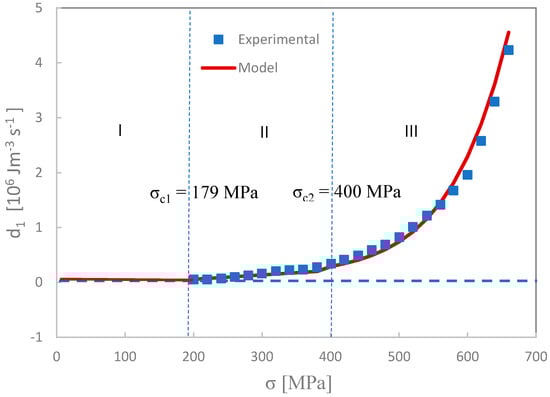 Guo et al. studied the thermographic behavior of FV520B stainless steel under different stress amplitudes [22], and they observed that the relationship of dissipation energy vs. stress amplitude (d1 vs. σ) exhibits a curve, as shown in Figure 4. They divided the curve into three stages: (i) pure elastic (reversible), (ii) anelastic internal friction, and (iii) intrinsic dissipation, marked by two critical stresses, σc1 = 179 MPa and σc2 = 400 MPa for the material. The first critical stress corresponded to the deviation from the initial elastic line, i.e., the proportional limit on the tensile curve, below which there was no energy dissipation by pure elasticity. The second critical stress divided the stages of linear and nonlinear dissipation, which was found to be close to the fatigue endurance limit obtained from the conventional fatigue testing [22]. Here, the “bilinear” relationship of the Risitano method is apparently not sufficient to clearly define the “intersection”. Between σc1 and σc2, the dissipation energy appears to be a linear function of the applied stress amplitude. Guo et al. argued that internal friction occurs in the stress range (σc1 < σ < σc2) as a result of the movement of dislocations, but the process returns the atoms to their equilibrium positions, thereby increasing the kinetic energy and temperature because of releasing the excess energy gained during the movement. In this sense, internal friction does not contribute to fatigue damage.