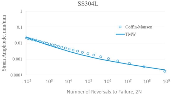 Using Equation (34) to calculate the plastic strain at the given stress level, and using Equation (32) with E = 193 GPa, ws = 2.4 J/m2, b = 2.48 × 10−10 m (same as steels in [45,59]), Rs = 1/3 [45] to calculate the fatigue life, the TMW model is compared with the Coffin-Manson relation, as shown in Figure 7. It is seen that the agreement of the TMW model with the experiment is very good. It should be emphasized that, in this calculation, Equation (32) provides class-A predictions without the need for the event data for calibration.