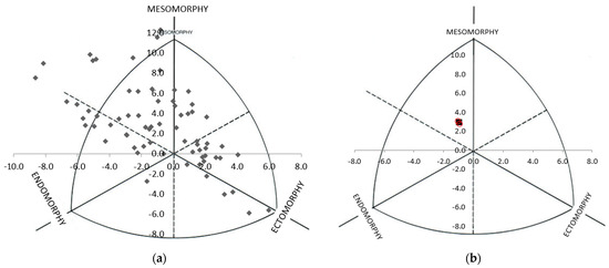 - Carter, J.E.L.; Mirwald, R.L.; Heath-Roll, B.H.; Bailey, D.A. Somatotypes of 7- to 16-year-old boys in Saskatchewan, Canada. Am. J. Hum. Biol. 1997, 9, 257–272. [Google Scholar] [CrossRef]