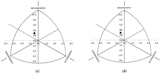 Somatocharts demonstrating: (a) distribution of somatotype for study participants (n = 68); (b) mean somatotype for population with RTEM mean ranges; (c) Mean somatotype for population with L23TEM mean ranges; (d) Mean somatotype for population with L1TEM mean ranges. ▪ = population mean. O = RTEM 95% confidence intervals.