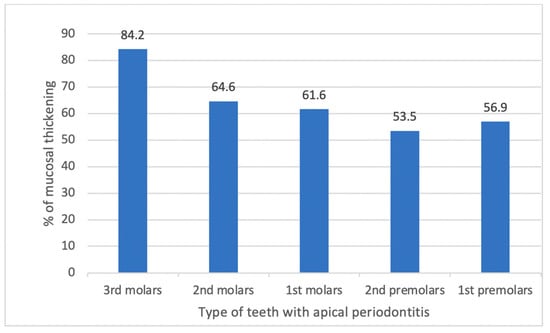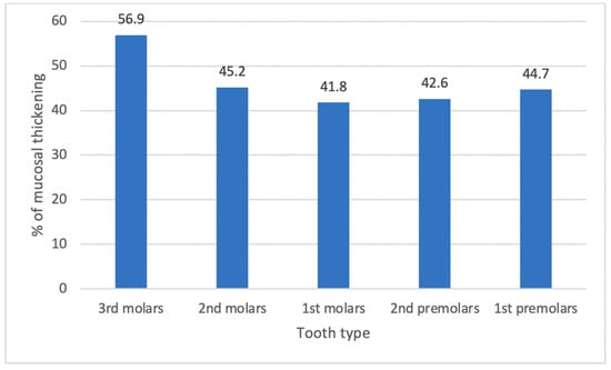 The relationship between different teeth and thickening of the mucosa of the maxillary sinus was explored, as can be seen in Figure 1. There was MT associated with 44.4% of molars and premolars, all of which did not undergo any type of apical surgery, e.g., root resection or apicectomy. There was a significant difference between the teeth, and the lowest percentage was found for the first molars. If looking at the relationship of teeth to the sinus, other studies assessed the relationship between the maxillary molar and premolar roots and the maxillary sinus [28,29,30,31]. In one of the studies, the mean distance between the maxillary posterior teeth and the maxillary sinus floor was found to be 1.97 mm [28]. In another study, the maxillary first and second molars were assessed, and it was found that they had a close relationship with the maxillary sinus floor in 40% of cases [30]. The palatal roots of molars have been shown to be closer to the antral floor and closer to the maxillary sinus than the palatal vault in 20% of cases [29]. This is probably due to the divergence of the roots and how the buccal and palatal roots saddle the sinus.