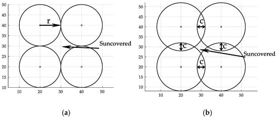 In Figure 1b, the value is an intersection level of the sensors’ coverage areas. Taking into account value , values covered by one sensor area Equation (3) and uncovered territory Equation (4) can be calculated as follows: