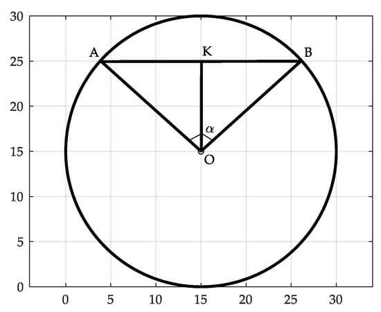 In Equation (6), is the value of the area of intersection of the coverage areas with intersection level . This value is equal to twice the area of the circle segment with radius and chord (Figure 2).