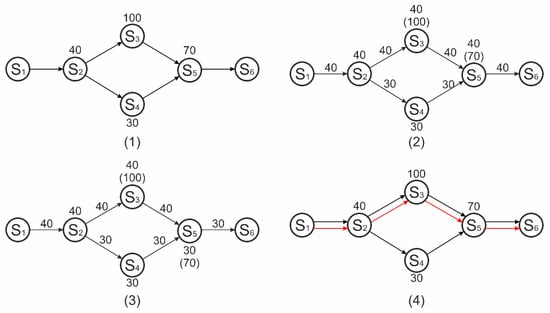 Additionally, in the case of different bandwidths, the survivability of the sensor network can be estimated in case of loss of the sensor or communication channel that provides the best bandwidth. To make an assessment, we find the channels and sensors that provide maximum data flow with the Ford–Fulkerson algorithm []. In our case, the result of using this algorithm will be a vector of network elements that provide the maximum data flow. The max flow sensors’ vector is denoted as and max flow transition vector as . Max flow value is denoted as . The assessment of the survivability of the sensor network in case of loss of the sensor or communication channel is similar to the algorithm described in []. The difference is in finding the value of the maximum flow. According to this, vectors and will contain elements in the absence of which the value of the maximum flow is not reached. Estimates of the survivability of the sensor network in case of loss of the sensor or communication channel, providing the maximum bandwidth of the sensor network are as follows: