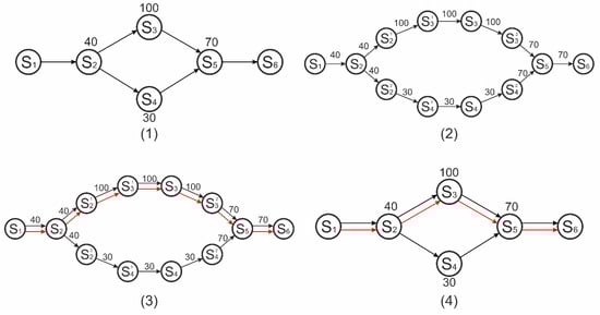 The next method is to conditionally replace the sensor with two sensors connected by a communication channel with the bandwidth of the selected sensor. After solving the problem of finding the maximum flow and reverse replacement, we obtain sensors and appropriate communication channels that ensure maximum data transmission in the network. Schematically, this can be depicted as follows in Figure 4.