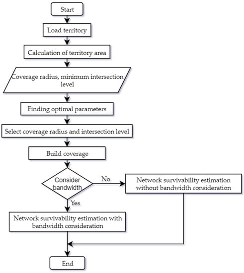 In the first stage after loading the territory, the area of the territory is automatically calculated. Next, the user must enter the input parameters, which include the radius of the coverage of the sensors and the minimum level of the intersection of the coverage areas. After the results are received in the form of Pareto-optimal pairs of the radius of coverage and the level of the intersection of the coverage areas, the user selects the required values. Then the coverage of the territory is built in accordance with the selected values of the parameters. Once the coverage is built, the survivability of the resulting network is assessed and vulnerable sensors and communication channels are searched. This procedure is available in two modes: taking into account the bandwidth of the network elements, and without taking into account the bandwidth of the network elements. The assessment results in five estimated values: the overall survivability of the network, survivability relative to the sensors’ loss, survivability relative to the loss of communication between the sensors, survivability relative to the loss of maximum bandwidth sensors, and survivability relative to the loss of maximum bandwidth connections. In the case of estimating the survivability of the network without taking into account the bandwidth of the network components, the corresponding estimates will be equal to one.