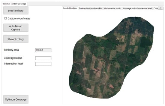 Let the area be covered by sensors with a given coverage radius and the level of the intersection of coverage areas. The territory was loaded in the form of a picture in any known format, the boundaries of the territory was captured automatically and the area was automatically calculated (Figure 6).
