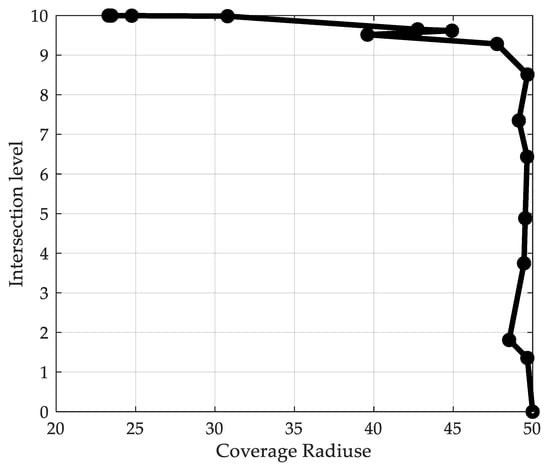 The input parameters are: area of the territory is 119,145.5 , the maximum available coverage radius is equal to 50 m; the maximum intersection level is equal to 10 m, the topography is not accounted for and coverage is limited to a circular communication path around each sensor. Using the developed method, the optimal pairs of coverage radii and the values of the intersection of the coverage areas with which the maximum coverage is achieved at the minimum cost of the network were obtained. This set is shown in Figure 7.