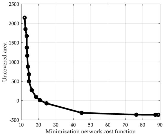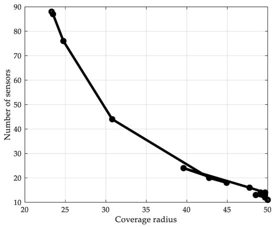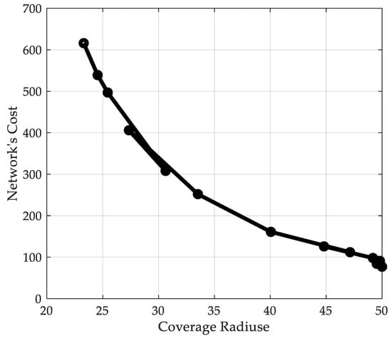 A genetic algorithm was used to solve the problem of finding the optimal parameters that provide maximum coverage at a minimum cost. The parameters of the genetic algorithm are: population size is equal to 200; tournament selection with size 2; reproduction with crossover fraction of 0.8; crossover function is intermediate with ratio of 1; forward migration with fraction of 0.2 and interval of 20; count of generations is equal to 200; stall generation is equal to 100; and the function tolerance is equal to . The results are presented in Figure 7, Figure 8, Figure 9, Figure 10 and Figure 11. The Pareto optimal combination of the coverage radius and intersection level, which can be used to find the maximum coverage with minimum network’s cost are presented in Figure 7. The number of sensors with the appropriate coverage radius required to cover the area is shown in Figure 8. One of the objective functions of the presented problem is the network cost function. The relationship between the uncovered area, the number of sensors, and the network cost’s minimization function is shown in Figure 9 and Figure 10. In Figure 11, the cost of the network is shown depending on the coverage radius of the sensors costing 7 conventional units each.