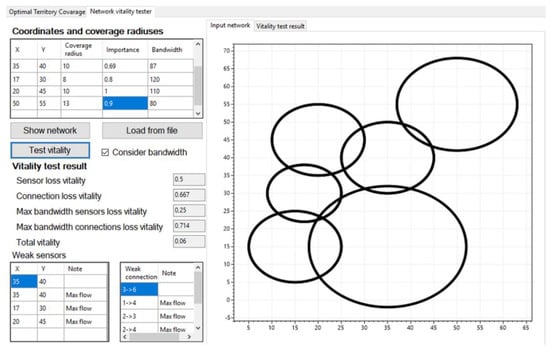 According to the proposed method, a vitality value of 1 means that this network is viable in case of loss of the sensor, connection between sensors and maximum bandwidth elements. The obtained results indicate that the network is very vulnerable with total vitality of 6%. The developed user interface allows the user to clearly identify vulnerable network elements according to the relevant criteria and the results are displayed in the relevant tables and textboxes. Note, “Max flow” in the corresponding result columns means that the given sensor or connection is weak in vitality testing considering bandwidth. The user can also upload data about the network settings in the form of spreadsheets. The developed software can work in two modes: with and without bandwidth consideration.