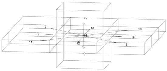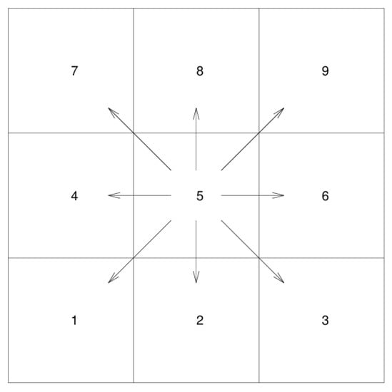 In order to provide the state sets for path planning, the area for AUV deployment is mapped to discretized grids according to the bathymetry and coastline. Islands or obstacles, where the AUV cannot pass through, are marked on the gridded map. In the 2D case, the AUV moves only on a horizontal level. The grids, where the AUV can arrive at the successor step, are labeled by numbers 1 to 9 (Figure 1). Initially, the AUV is in the center grid 5. After the AUV takes an action i (i = 1, 2…9), the AUV can only appear in its adjacent eight grids. Otherwise, it stays in grid 5 by taking no action. In the 3D case, the AUV can reach 27 cubes (Figure 2). Technically, it can only move to its adjacent 26 cubes by taking effective action, otherwise, staying in cube 15 by taking no action. Since the aspect ratio of the ocean—which is a ratio between the depth and horizontal length scale—is usually much less than 1, only vertically upward and downward movements are kept for the vertical actions, thus the action set can be significantly reduced through dumping the other 16 actions related to vertical movements. Now, the size of the state set s is reduced from 27 to 11. This division of actions is suitable for the practical movement of AUVs. Table 1 shows the partitioning of the 3D action set.