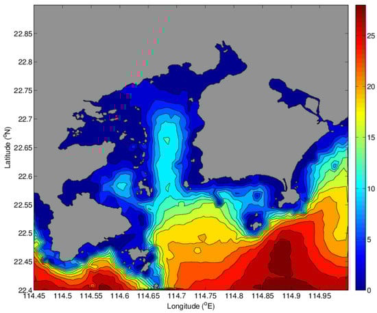 Tidal currents are predicted using the Finite Volume Community Ocean Model (FVCOM) developed at the University of Massachusetts [], which is a regional ocean model solved using the finite volume technique in unstructured grids. The model is driven by the tidal flows on the open boundaries which are provided by the TPXO global prediction [], including eight primary tidal constituents (M2, S2, N2, K2, K1, O1, P1, Q1). The model performance has been validated through comparison with the tide gauges in Daya Bay. The AUV initially starts at 17:00:00 6 October 2013 (UTC) corresponding to an ebb tidal course, shown in Figure 4. The tidal current flows offshore and reveals a spatial variation related to water depth. The predicted tidal currents are provided to the MDP method so that the environment is fully observable.