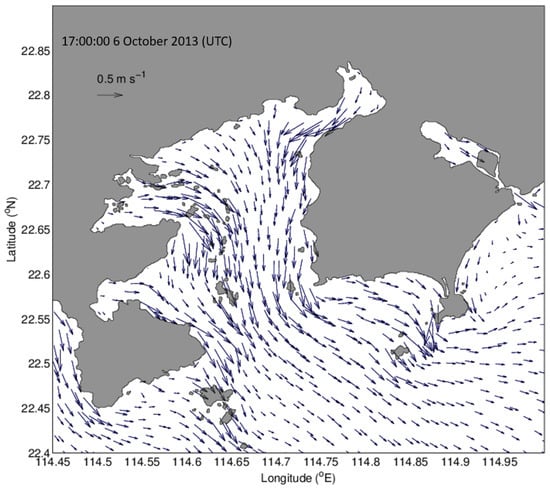 The tidal current in the experimental area at 17:00:00 6 October 2013 (UTC) was predicted using the FVCOM. It is in an ebb tidal course, in which seawater flows out of Daya Bay.