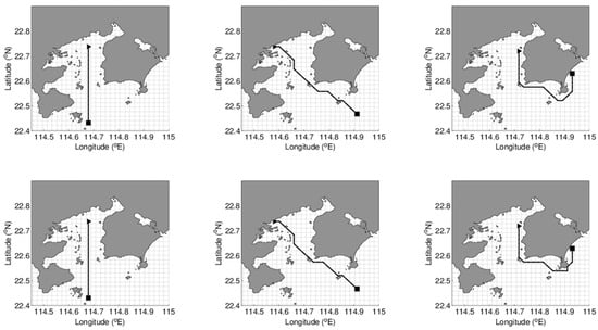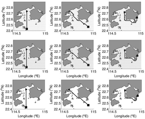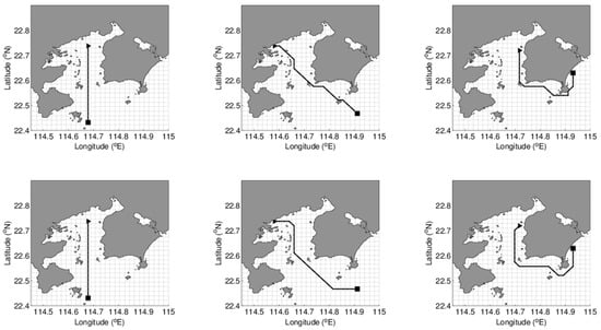 Figure 9 shows the MDP algorithm path with consideration of the time-varying ocean current, and Table 7 is the cruising time. The ocean current is updated every hour. The cruising time in each case is over 14 h, which indicates that the tidal current turns direction more than 4 times during the AUV deployment.