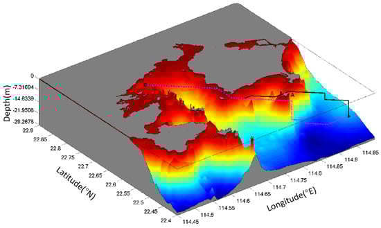 The Daya Bay, a semi-closed bay on the northern coast of the South China Sea, is selected as the experimental field for numerical simulations. Autonomous platforms equipped with environmental sensors are planned to be deployed for environmental monitoring as a complement to traditional means, such as research vessels, buoys, etc. The coastline of Daya Bay is retrieved from the Global Self-consistent, Hierarchical, High-resolution Geography database (GSHHG) and the bathymetry from a digitalized nautical chart (Figure 3). The geographic coordinates are first transformed to the Cartesian coordinates. Different from land-based robots, obstacles encountered by AUVs in the ocean are offshore islands, bottom topography, and ships. The ships can be avoided using real-time marine traffic information, such as barrier sonars or ship tracking systems. The AUV maintains a certain distance from the seafloor using single-beam sounders. Since the AUVs are usually deployed in the open ocean, only coastline and islands are considered as obstacles in our simulation. Obstacles due to bottom topography and ships are ignored. The travel time for the AUV arriving at the target from its initial location is used to evaluate the performance of the MDP method.