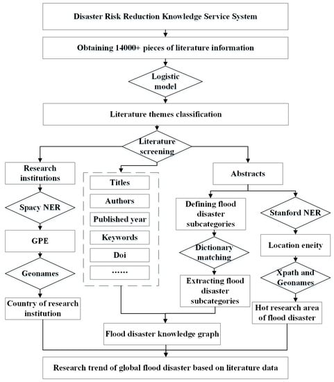 Figure 1 shows the technical roadmap of the study. The study first performed literature data acquisition via web crawlers from DRRKS. Then, a logistic model was trained to classify the literature themes. On this basis, literature screening was conducted to obtain the main data of this study. For the screened abstracts, dictionary matching was used to analyze flood disaster subcategories, and Stanford named entity recognition (NER) was used to identify flood disaster research hot areas. For the screened research institutions, Spacy NER was used to analyze the distribution law of the authors’ research institutions. Finally, the crawled and extracted disaster information was integrated to construct a flood disaster knowledge graph.
