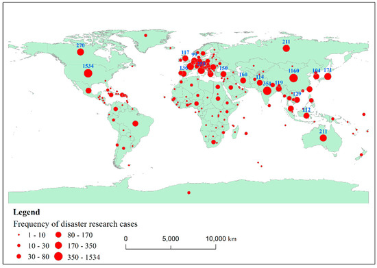 Spatial distribution of flood disaster occurrence and hot research areas.