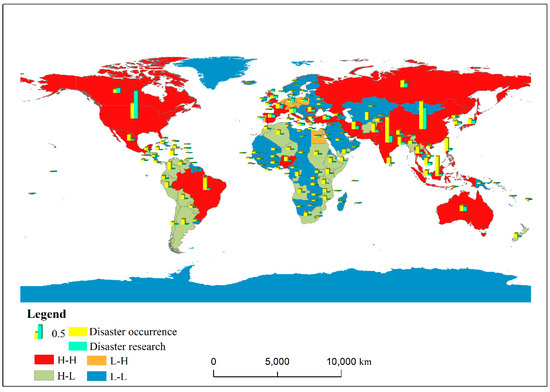 In intercontinental terms, Figure 4 shows that the disaster occurrence and research in North America and Oceania are of the H-H type. South America is characterized by polarization. Brazil has attracted high-frequency disaster studies, but only a few studies have been conducted in other countries in the region. Asia is a mixture of four types with diverse distributions. Europe displays a gradient change in research frequency from high to low, from western Europe to middle and eastern Europe. Africa displays low frequency occurrence and low frequency research, but there are also internal differences among East Africa, Central Africa, and West Africa, which are distributed along a strip. Based on the above analysis, it is suggested to focus on regions with high-frequency disasters but low-frequency studies, such as Latin America and the Caribbean, Africa, Eastern Europe, and West Asia. These regions should increase investment in disaster prevention and reduction and pay more attention to policies.