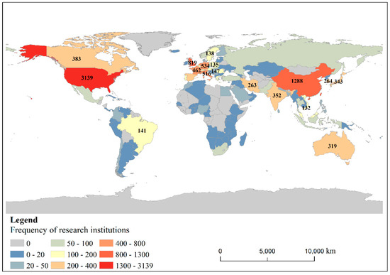 The authors’ research institutions are in 130 countries, and the frequency distribution of each country is between 1 and 3139. The frequencies of the top 20 countries are shown in Figure 5. Most of the countries with high frequencies are in Europe, Asia, America, and Oceania. The highest frequency is in the United States, which appears 3139 times, far more than in other countries. Canada in North America and Brazil in South America also have high frequencies. Next is China, with a frequency of 1288, which is the highest frequency among Asian countries. The United Kingdom ranked third, has the highest frequency among European countries at 819. Half of the top 20 countries are European countries, with values ranging from 138 to 819, but none has a particularly prominent frequency. Australia has a relatively high frequency in Oceania. According to Munich Re, six of the 10 largest natural hazards in the world in 2020 occurred in the United States, while the severe flood disaster that occurred in China during the summer monsoon rainfall was Asia’s most severe natural hazard. Therefore, the impacts and losses caused by flood disasters have been sufficient to attract the attention of scholars in both China and the United States.