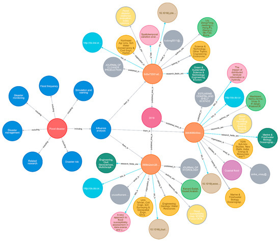 Using the study’s data organization model, the extracted flood disaster information and the crawled literature information were integrated in the form of triples, stored in the Neo4j native database, and visually displayed. The results are shown in Figure 7, which includes 39,679 nodes and 64,908 edges. Node labels include UID, theme, title, subcategory, institutions, keywords, doi, authors, link, journal, year published, and email. The relationship types include belong_to, subcalss_is, theme_is, etc. Nodes with different colors represent different categories of entities. The larger the node, the higher the level of the entity’s category. The red bubble indicates the root node of the flood disaster, the blue bubble represents the research theme, the orange bubbles represent the studies, and the other color bubbles represent the relevant information on each item in the literature. The left side of Figure 7 shows the overall distribution of 5181 flood disaster studies, which were divided into seven themes; the numbers of each theme were relatively evenly distributed. The right side of Figure 7 provides three literature items as an example, showing the details of each literature item in the flood disaster knowledge graph. The three articles can be connected with each other using “year” and “2019” as the same filed value. The knowledge graph can establish links between articles, and ultimately form an interconnected literature network.