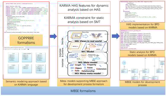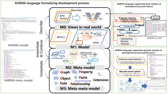 The GOPPRR method proposed by Wang et al. is used to model reasoning through ontology, but the method lacks support for simulation analysis [], so, based on their contribution, a semantic modeling language KARMA is developed based on the GOPPRRE approach, as shown in Figure 1. Using KARMA, metamodels are developed based on different process modeling specifications, such as BPMN or ISO/IEEE 15288 standards []. For the representation of the development process of complex systems, business process diagram (BPD) models are developed based on metamodels. The KARMA language formalizes the metamodels and models based on a unified specification. Moreover, through the KARMA language, property values are captured to define formal constraints of the BPD models based on SMT. Then, the SMT solver implements the static verification of development processes based on KARMA language. Furthermore, continuous system features for each task and discrete event system features are defined in each object instance and relationship instance, respectively, using KARMA language based on hybrid automata simulation (HAS). Finally, for dynamic analysis of development processes, simulation of process modeling is implemented by an HAS solver to provide results.