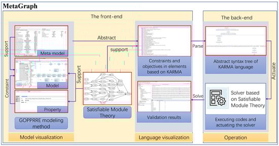 Based on the basic MBSE formalism in KARMA, static cost analysis is implemented for each work task based on SMT solver in MetaGraph 2.0 []. As shown in Figure 3, MetaGraph supports metamodel development and modeling based on the GOPPRRE modeling method, where various work tasks based on the design requirements of the development process are constructed using the BPD metamodel for verification implementation. Then, KARMA language is used to formally describe the constraints of property instances to verify based on the defined constraints according to design requirements related to development process. Finally, the KARMA language is compiled by constructing and traversing the abstract syntax tree, which is used to verify if the constraints are satisfied by executing the SMT solver. The static analysis results, whether the constraints are satisfied, are transmitted to the result perspective in MetaGraph and demonstrated to the stakeholders.