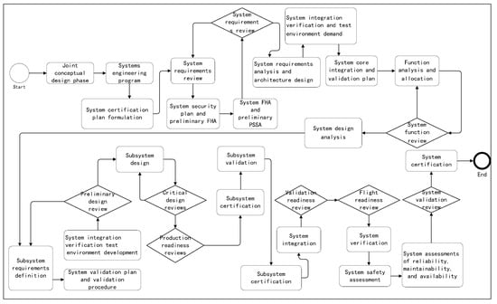 In the case study, the BPD Graph was used to develop the development process of the aircraft avionics system development. A process model was developed using the BPD metamodels, as shown in Figure 7, which includes key work tasks for the entire process, such as start event, systems engineering plan task, system design analysis task, system security assessment task, critical design review task, and end event task.