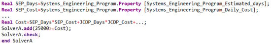 where refers to the days for each work task, refers to the cost for each day in one work task (e.g., the days of system engineering program is 13 and its cost of each day is CNY 50,000, as shown in the Figure 8, , (CNY 10,000)). refers to the constraint function, refers to variables to construct constraint functions (in this case, is the total target cost CNY 250,000,000), and ∈ refers to the , which is required to satisfy the constraint. To achieve this, we used the KARMA code .