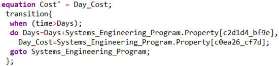 A hybrid automaton is a finite state machine with discrete jump transitions and continuous variables. The dynamics of the entire development process can be calculated by using the finite state machine that represents a finite number of states and a mathematical model of behavior, such as transitions and actions between those states []. In this study, KARMA language was realized to express the group, equation, transition, and other state attributes based on the hybrid automata theory. We defined the cost equations and variable values in the object nodes. In addition, transitions were defined in the relationships, such as day stacking and cost accumulation. Finally, cif solver was used for the simulation. From the simulation results, stakeholders can adjust the task process through the dynamic quantitative data of cost and predict the dynamic performance of cost and time consumption throughout the life cycle.