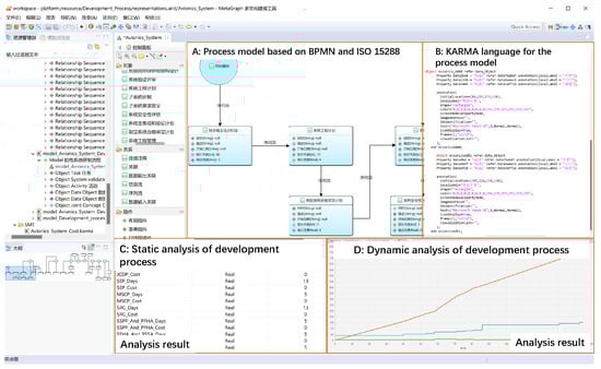From a qualitative perspective, compared with the traditional avionics system development process planning using documents, the given approach can describe the development process of the avionics system and provide decision-making options for project managers by implementing the static and dynamic analyses. The KARMA language is a textual and semantic modeling language with meta-metamodeling capability developed based on the GOPPRRE meta-metamodels. It supports the construction of metamodels for development process from different domains and process modeling specifications with strong model description capability and expansibility. In this study, we built a BPD model that supports the process description of the aircraft avionics system, satisfying the product life cycle design process of the 15,288 specifications, such as tasks of system design and system requirements definition. However, it describes symbols in the BPMN standard, such as nodes of start event and end event, providing a consistent model building and communication environment for avionics developers.