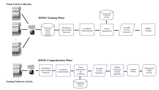 For human activity recognition, we use an RGB-D sensor of 3D skeleton joints [23,24,25,26,27] to construct a database in terms of skeletonized human activities that occur in daily life. The proposed framework, namely human activity comprehension (HAC), is elucidated as follows: First, the features are extracted from ten selected skeleton joints of entire user poses using the RGB-D sensor. After preprocessing of key element skeleton joints, the vector quantization encoding procedure extracts the features as the codebook for the HMMs, of which the hidden Markov model of unknown sensing human behavior is scored to target the specific human activity through the maximum posterior probability. The details are described in the following sections.
