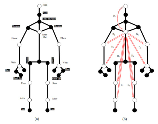 Twenty-five defaulted joints of black-or-white circle points are provided by a third-party sensor in (a), Only ten white circle points were selected for the relative position connection and distance calculation by nine red lines shown as D1, D2……D9, from centroid (Spine Mid) to the other 9 joints in (b), The remaining 15 unselected points labeled on the black circles points show no affection during activity detection in (b).