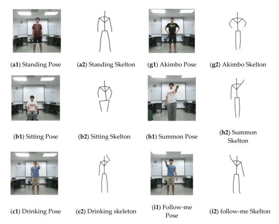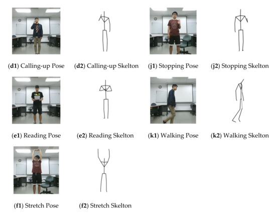 Sampling images of the assessing eleven poses in activities snaps with corresponding skeletons from videos of the collected database. Activities labeled from top to bottom, left to right, including (a1,a2) standing, (b1,b2) sitting, (c1,c2) drinking water, (d1,d2) calling up, (e1,e2) reading, (f1,f2) stretch, (g1,g2) akimbo, (h1,h2) summon, (i1,i2) follow-me, (j1,j2) stop gesture, and (k1,k2) walking poses.