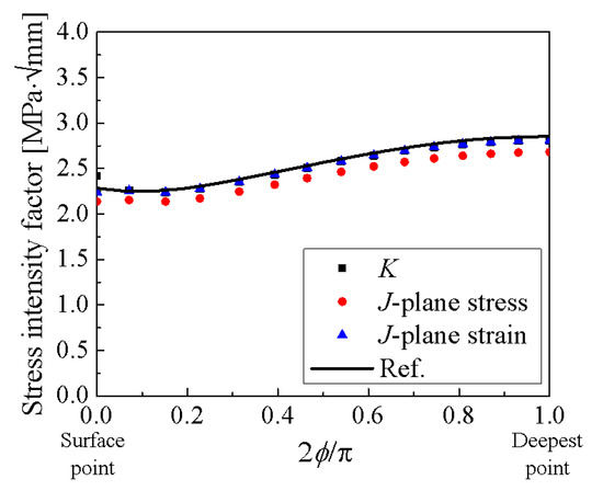 Figure 4 shows the difference in SIF according to the SIF calculation methods along the crack tip. In the domain integral method, the SIF values converted through the assumption of plane stress and plane strain were expressed as J-plane stress and J-plane strain, respectively, and the SIF value calculated through the interaction integration method was expressed as K. The SIF results were compared with the theoretical solution proposed by Raju-Newman [22] and the results of the theoretical solution are denoted as Ref. In Figure 4, J-plane strain and K show SIF values similar to those of Raju-Newman solution and J-plane stress slightly smaller. However, the plane stress and plane strain conditions can be changed depending on the shape and constraint of the structure. Therefore, in this study, the interaction integral method reflecting the constraint effect was selected as the SIF calculation method.