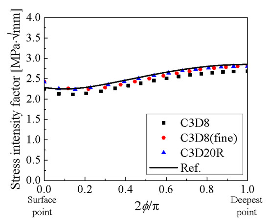 The shape of the pipe with semi-elliptical inner surface cracks considered in this verification is the same as the shape considered in Section 4.1 (Figure 9). The inner radius and thickness of the pipe are 150.368 mm and 40.132 mm, respectively, and the semi-elliptical crack has a depth of a = 10.434 mm and a length of l = 118.098 mm.